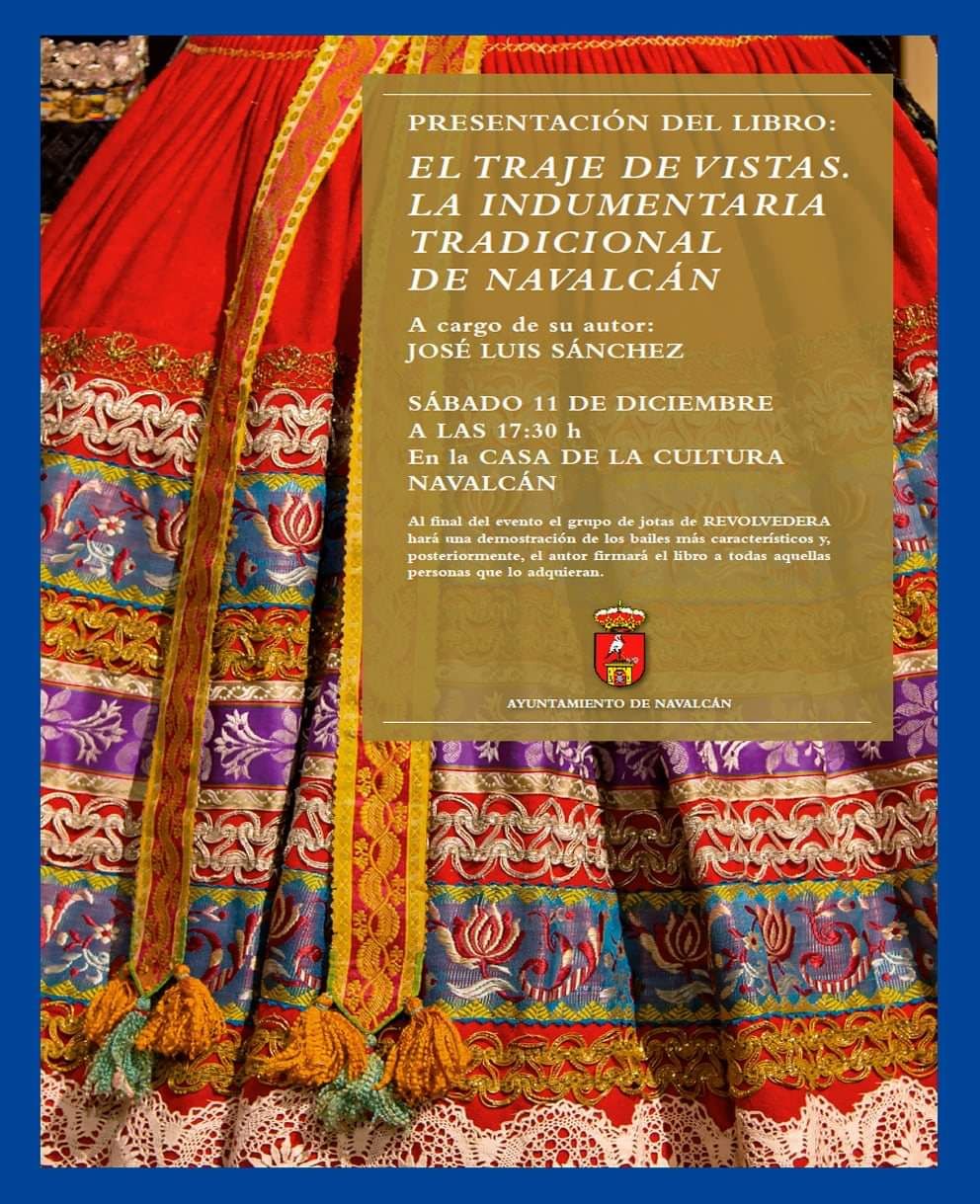 El Ayuntamiento ha programado este viaje Cultural a Madrid para asistir a la presentación de nuestro libro, "EL TRAJE DE VISTAS. LA INDUMENTARIA TRADICIONAL DE NAVALCÁN", que se realizará en el Museo del Traje, con aforo limitado. La presentación correrá a cargo de su autor José Luis Sánchez, acompañado del grupo REVOLVEDERA.