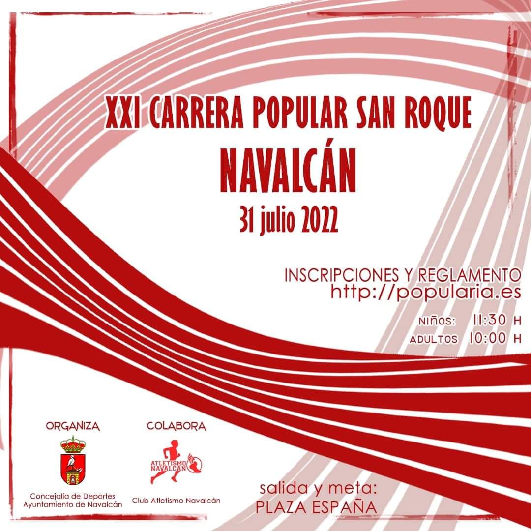Después de dos años vuelve la CARRERA POPULAR DE SAN ROQUE en colaboración con el CLUB ATLETISMO NAVALCÁN, para poder disfrutar y ponerte a prueba el próximo domingo día 31 de julio a partir de las 10:00 horas en la Plaza de España.