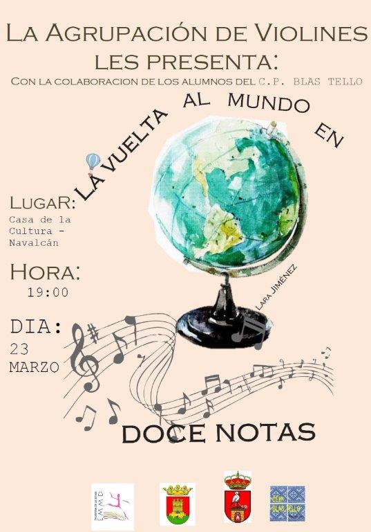 El próximo SÁBADO día 23 de Marzo en el auditorio de la Casa de la Cultura, a las 19:00 de la tarde, se podrá disfrutar de un gran concierto LA VUELTA AL MUNDO EN DOCE NOTAS ofrecido por la Agrupación de Violines de la Escuela de Música de Talavera de la Reina, con la colaboración de los alumnos de Navalcán, del C.P. BLAS TELLO. No te lo puedes perder. Ven y disfrutar de un paseo por el mundo con la música de diferentes países. Te esperamos
