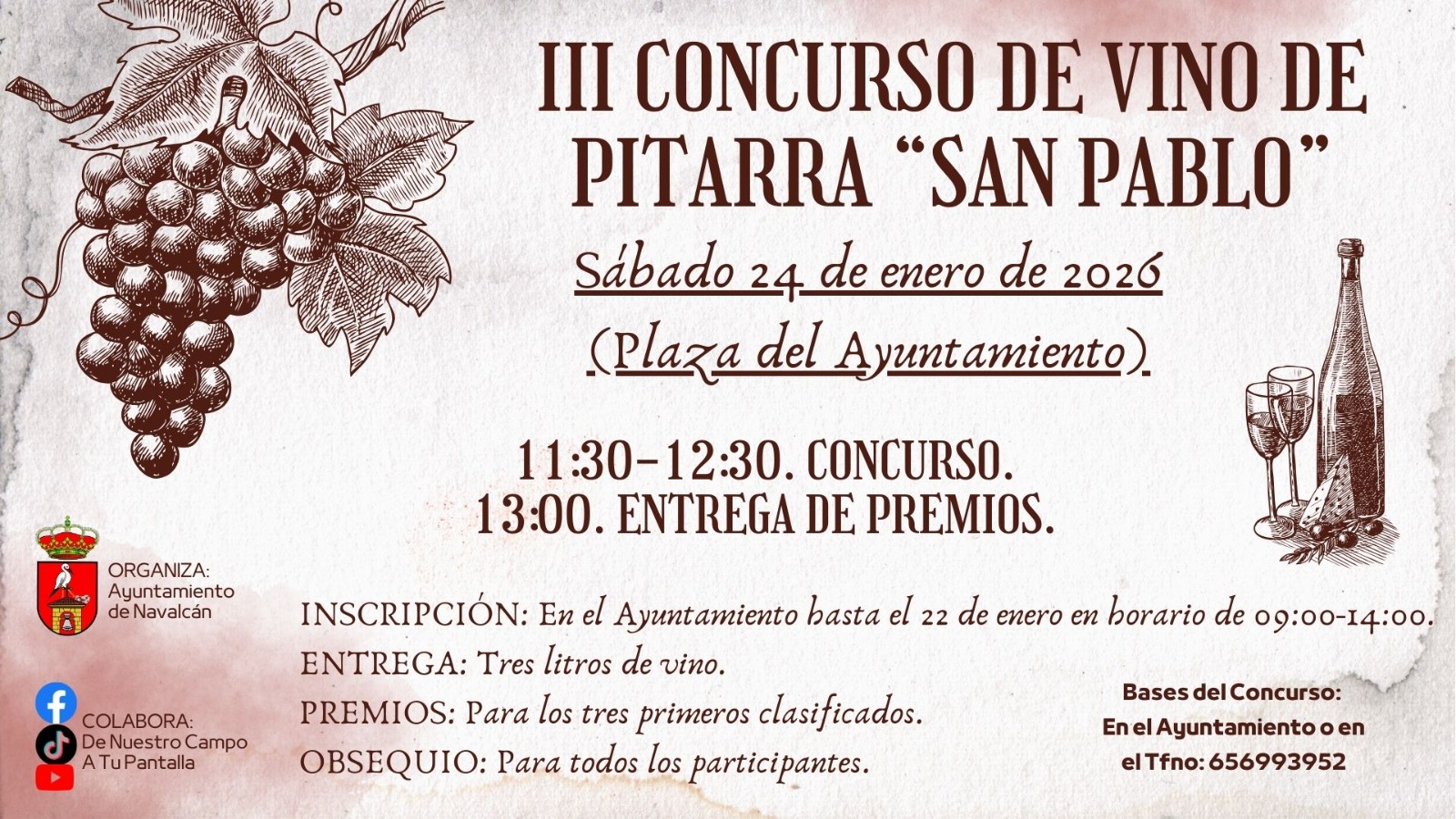 Vuelve la celebración del III Concurso de Vino de Pitarra “San Pablo”, un evento que continúa consolidándose como una de las actividades destacadas dentro de la programación de las Fiestas de San Pablo. El certamen tendrá lugar el sábado 24 de enero de 2026 en la Plaza del Ayuntamiento.